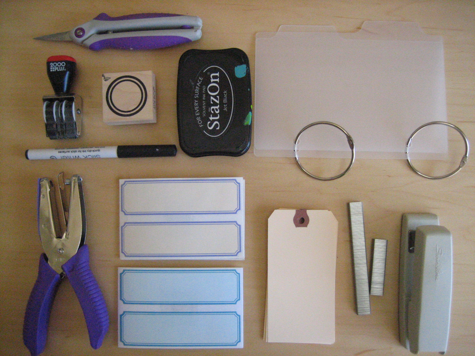 scissors, date stamp, Paper Source circle stamp, StazOn black ink, Kolo photo dividers (turned into a mini book with a hole punch and bookrings), American Crafts slick writer, hole punch, Paper Source labels, office supply store hang tags, staples, stapler.
